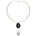 Elevate your elegance with this one-of-a-kind Fred + Ginger choker, crafted in 18K yellow gold. Featuring an oval black stone, a lustrous white pearl, and ten 0.15ct round diamonds, this 12.5" statement piece is complemented by a 2.5" adjustable chain, allowing a perfect fit. Its refined design brings timeless sophistication to any ensemble.  Carefully crafted in New York and ethically collected from beaches around the world.