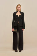 The Yvonne Jacket combines tailored elegance with contemporary design. Crafted from a refined wool blend, this structured blazer features a striking angled hem that adds modern movement to a timeless silhouette. The plunging neckline and front button closure create a polished yet daring aesthetic, making it an ideal layering piece for elevated everyday wear or professional settings.