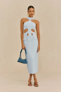 A sophisticated midi knit dress with a high neck, artful front cutouts, and layered bodice. Effortlessly elegant for any occasion.