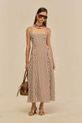 Linen blend midi dress with a square neckline, fitted bodice, and open back detailed with a jumbo buckle and corded piping. Versatile and refined for any occasion.