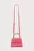 This Nano Sybil Handbag Bubble features a delicate pink raffia body complemented by leather top handles and a matching strap. Gold-toned hardware adds a refined touch, while the removable crossbody strap offers versatile styling options for day or evening wear.