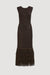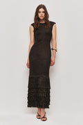 The Breeze Knit Midi Dress combines refined tailoring with contemporary edge. Crafted from textured knit, this midi silhouette features a sleek slim fit enhanced by structured shoulder pads for a polished, commanding presence. A sculptural metal zip adorns the back, adding architectural interest, while playful fringe at the hem introduces movement and dimension. Perfect for elevated everyday wear or sophisticated evening occasions.
