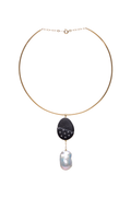 Elevate your elegance with this one-of-a-kind Fred + Ginger choker, crafted in 18K yellow gold. Featuring an oval black stone, a lustrous white pearl, and ten 0.15ct round diamonds, this 12.5" statement piece is complemented by a 2.5" adjustable chain, allowing a perfect fit. Its refined design brings timeless sophistication to any ensemble.  Carefully crafted in New York and ethically collected from beaches around the world.