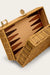 Carry elegance and entertainment in one refined piece. This whimsical rattan clutch features a supple leather backgammon board that unfolds from within, transforming your accessory into an instant game companion. The gold-toned chain strap adds a touch of luxury, while included game pieces and a delicate dust bag pouch ensure you're always ready for a strategic moment. Perfect for the discerning traveler who refuses to compromise on style or leisure.