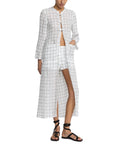 Effortless elegance in lightweight white check tweed. This full-length coat features three crochet button loops along the front chest, fabric-covered buttons, and a relaxed open body that drapes beautifully. The round neckline frames the face, while two front pockets add practicality. A subtle flare at the hem creates movement and polish. Pair with the matching Madeline Shorts for a coordinated look.