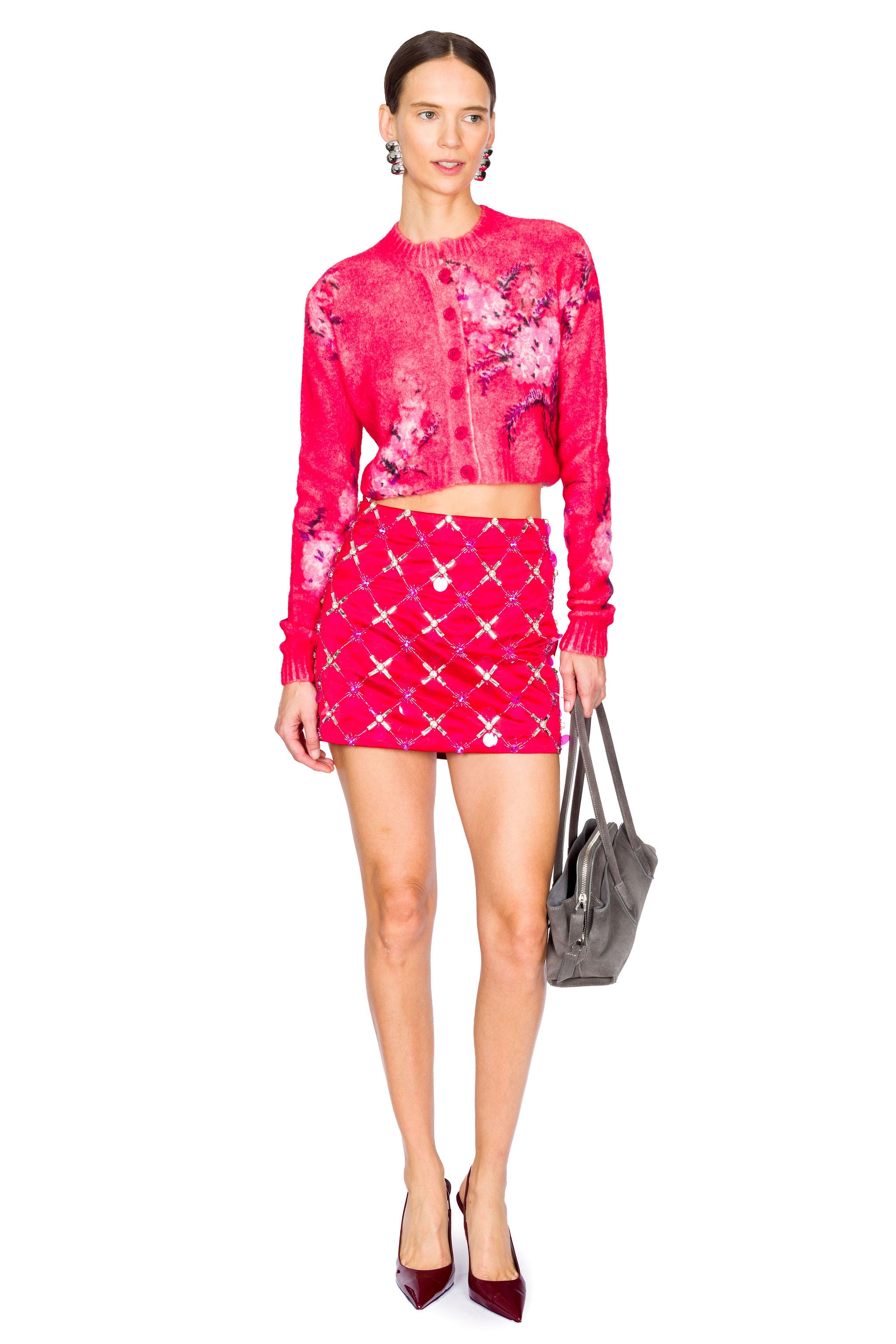Elevate your wardrobe with this cropped red cardigan, featuring an exquisite hand-painted floral design. . Perfect for adding a sophisticated touch to your look, this unique piece showcases meticulous craftsmanship and timeless style.