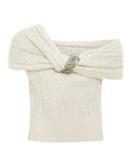 The Marla Sweater showcases an elegant asymmetrical silhouette with an off-the-shoulder neckline that exudes modern sophistication. Crafted in a classic cable knit, this short-sleeve piece features an embellished twist detail at the neckline, adding refined texture and visual interest. Perfect for elevating casual occasions or layering into polished ensembles, this versatile sweater balances comfort with contemporary style.