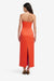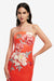Woman wearing an orange strapless maxi dress with floral patterns on a white background.