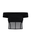 The Luiza Corset Top combines structured elegance with contemporary allure. This black mesh piece features a fitted corset silhouette that sculpts and defines, while delicate fabric gracefully drapes off the shoulders for an effortlessly refined aesthetic. The sheer mesh construction adds an element of intrigue while maintaining an air of sophistication.