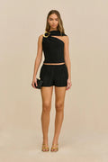 The Moira Top showcases architectural elegance with its distinctive origami plissé construction and asymmetric off-shoulder neckline. Delicate gold-toned metal embellishments trace the pleated fabric, creating dimension and visual intrigue. Cut to a cropped silhouette, this piece balances modern sophistication with refined craftsmanship—ideal for elevating both casual and dressed-up occasions with understated luxury.