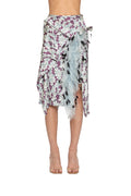 Elevate your wardrobe with this striking panel wrap skirt, featuring a captivating purple and blue print paired with elegant ruching for a flattering silhouette. The dramatic side slit is adorned with blue and black feathers, adding movement and sophistication to every step. Perfect for making a bold statement at special occasions or fashion-forward everyday styling. Style it with the matching Balconette Bra.