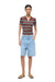 Woman wearing a striped polo shirt and denim shorts on a white background