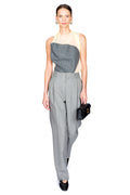 The Drop Waist Straight Leg Trouser offers a modern waistband with classic tailoring details. Its pleats and darts create a feminine shape, complemented by side pockets and belt loops, making it a refined choice for autumn and winter.