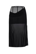 Elevate your silhouette with this striking black mesh midi skirt, where strategic draping creates an alluring interplay of coverage and reveal. The corseted waist detail cinches and defines, offering a refined focal point that commands attention. Crafted from delicate mesh, this piece balances sensuality with sophistication, making it an essential addition to any discerning wardrobe. Perfect for evening occasions or layered styling that celebrates modern elegance.