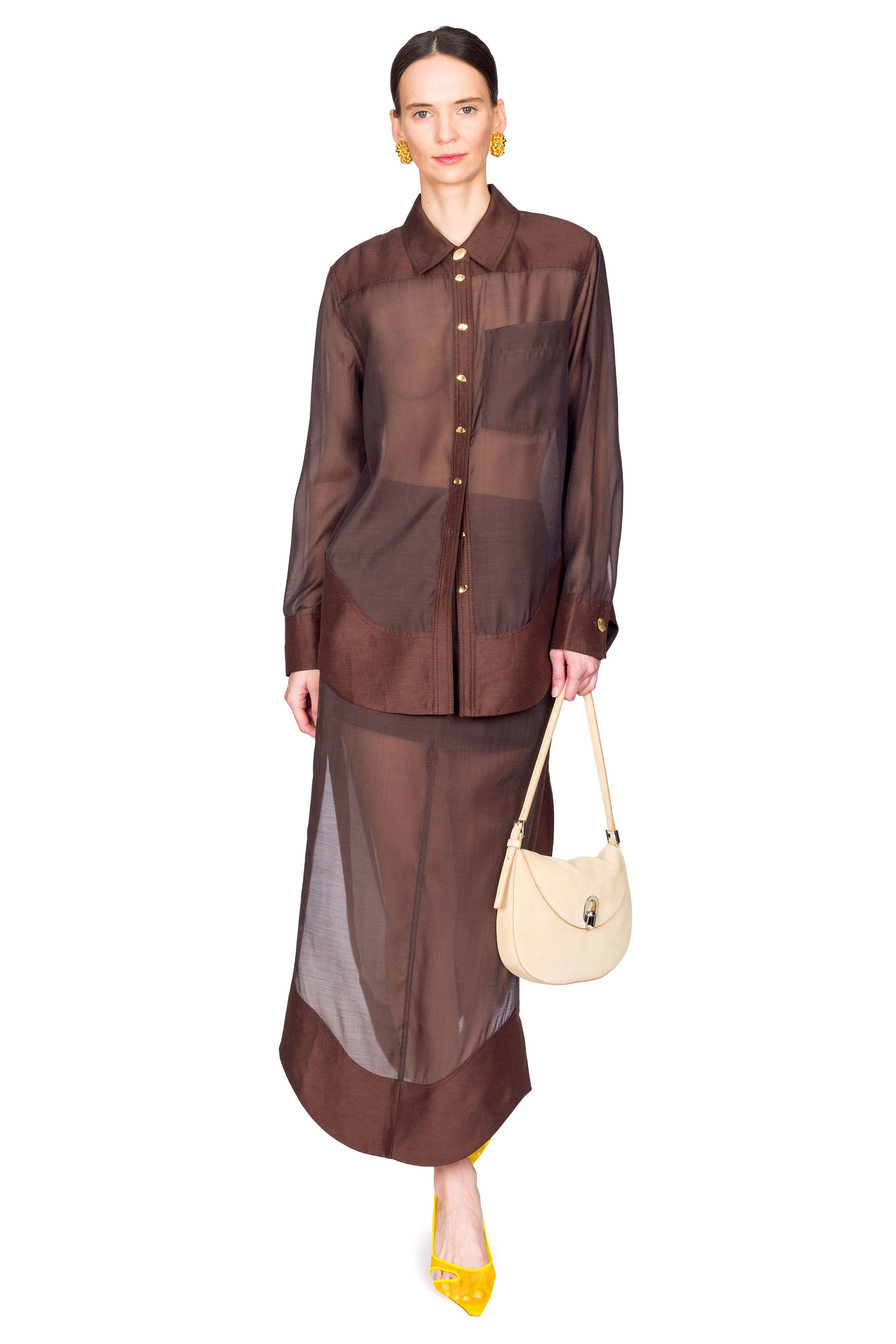 The Capture Skirt combines architectural elegance with wearable sophistication. Its sheer midi silhouette flows from a refined column shape, anchored by a discreet mini skirt lining for coverage and movement. A graceful side split adds dimension and ease, while the curved hem creates a flattering, modern line. An external back zip with a sculptural puller serves as both functional closure and design statement—a detail that transforms the everyday into the editorial. Wear it with the matching Capture Shirt.