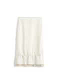Knee-length skirt crafted from luxurious heavy satin with a distinctive raw edge waist and hem. A sheer gauze underlayer peeks through, adding an elegant, sensual dimension to the piece. The relaxed straight silhouette drapes beautifully while maintaining structure, finished with a concealed side zipper for a seamless silhouette. Perfect for layering or wearing solo. Style it with the V Neck Satin Pullover Top.