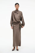 The Phoebe Silk Dress features an elegant dolman sleeve silhouette paired with a gracefully draped neckline that flatters the frame. Crafted from luxurious stretch silk satin, this piece moves with you while maintaining its refined structure. A subtle side tie at the waist adds dimension and allows for personalized styling versatility. Perfect for elevated occasions or refined everyday wear.