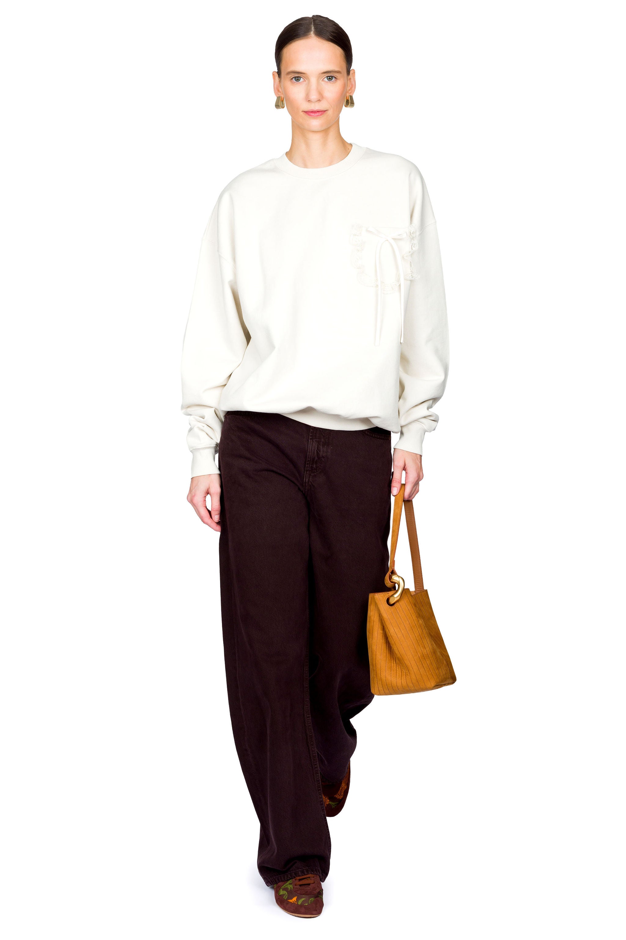 The Collins Bow Pocket Sweatshirt offers a graceful twist on the classic crew neck with a lace-trimmed breast pocket and a satin bow, combining simple elegance and comfort.