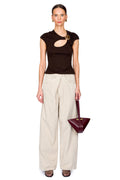 The Mineral Stone Hollow Tee offers a close fit in stretch rib fabric, featuring an off-centre cutout with a tiger’s eye resin ring. Cap sleeves and a high neckline provide a balanced and polished look.
