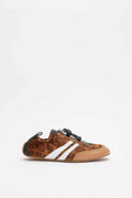 An everyday essential with an untamed twist. The On the Go Sneaker is reimagined in genuine leopard haircalf, bringing rich texture and attitude to its streamlined silhouette. Designed with a collapsible heel and elasticized back for easy slip-on wear, it moves with you wherever the day leads. The zipper-and-lace hybrid closure adds a utilitarian edge, while contrast stripes ground the look in sporty sophistication. A statement in motion—equal parts effortless and wild.