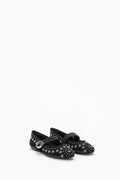 Black ballet flat shoes with silver stud floral patterns on a white background
