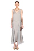 The Millie Gusset Dress combines fluid elegance with refined construction. This sleeveless piece features antique trapped silk in a double-layer design, with a gusseted waist that provides subtle structure without sacrificing movement. The deep V-neckline and scooped back create understated sophistication, while the asymmetric hemline adds an effortless, floor-sweeping finish. Perfect for those who appreciate timeless drape and quiet luxury.