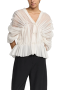 The Santos Top is an ethereal layering piece crafted from delicate Feather Organza. Voluminous pleats trace the V-shaped neckline and cascade down the sleeves, creating movement and dimension. The sheer finish adds an airy, translucent quality perfect for warm-weather styling or as a sophisticated overlay. A three-button opening at the front provides easy wear and adjustable coverage. Ideal for those seeking refined, editorial-forward pieces with architectural detail.