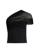 This black one-shoulder silhouette features a sophisticated ruched mesh overlay that drapes gracefully across the shoulder, creating dimension and visual interest. Perfect for elevated casual occasions or evening wear, the asymmetrical neckline and textured mesh detailing offer a contemporary edge while maintaining refined sophistication. A versatile piece that transitions effortlessly from day to night.