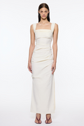 The Raf Dress in Bone by Paris Georgia features a soft structure, contrast bust panel, and side split. It fits close to the body and true to size, combining elegant design with modern details.
