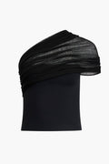 This black one-shoulder silhouette features a sophisticated ruched mesh overlay that drapes gracefully across the shoulder, creating dimension and visual interest. Perfect for elevated casual occasions or evening wear, the asymmetrical neckline and textured mesh detailing offer a contemporary edge while maintaining refined sophistication. A versatile piece that transitions effortlessly from day to night.