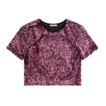 This boxy cropped t-shirt features shimmering pink sequins covering the entire garment, adding a touch of sparkle to your look. A subtle gemstone detail on one shoulder enhances its elegant yet playful design, making it perfect for stylish casual wear or special occasions.  Pair it with the Crystal Cluster Sequin Mini Skirt for a fabulous look.