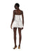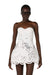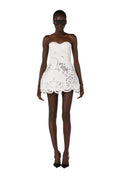 Elegant strapless corset-style top featuring delicate white embroidery with a charming floral design. The scalloped trim adds a refined, feminine touch to this sophisticated short dress. Perfect for special occasions or elevated everyday wear.  Style it with the matching Pantaloni Trousers.