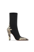 Italian-made square-toe ankle boots in stretchy black fabric with a chunky heel and croco-embossed details. Comfortable and versatile for any occasion.
