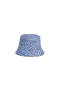 This refined bucket hat showcases a striking two-tone wavy pattern woven in blue raffia-effect material, delivering both texture and visual interest. Delicate embroidered lettering adds an artisanal touch, elevating the piece beyond casual wear. The structured silhouette and natural fiber aesthetic make it an ideal accessory for warm-weather styling, whether paired with resort wear or everyday ensembles. A versatile statement piece that balances craftsmanship with understated elegance.
