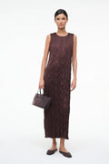 The Mizu Dress Earth features a plissé midi column cut with a removable waist tie for flexible styling. Wear it solo with heels or layer it over the Nami Pant for a coordinated look.