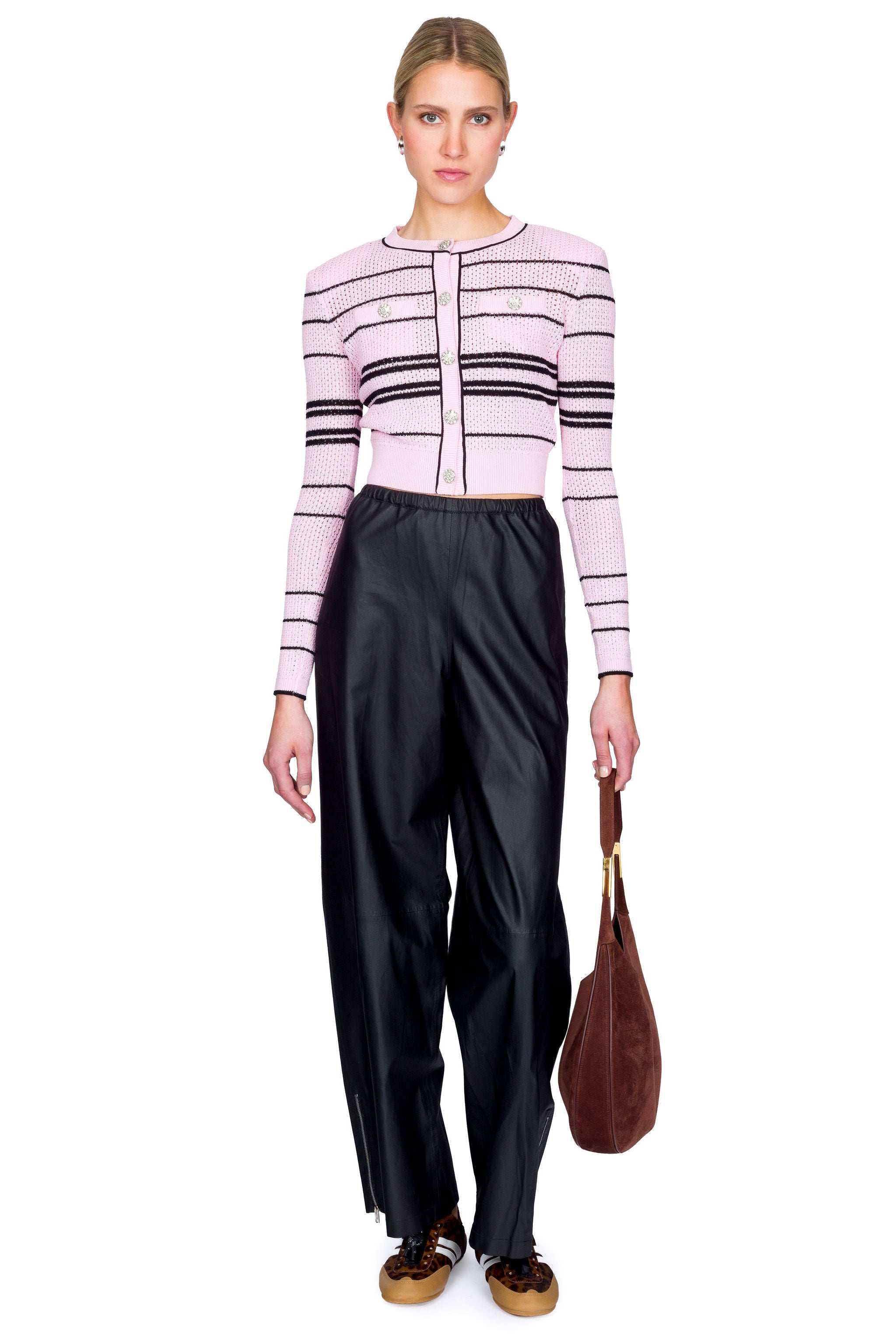 Striking striped cardigan with sparkling diamanté buttons and stretchy fabric for all-day comfort. Features a front button closure and removable shoulder pads for versatile styling. Pair with tailored trousers for polished looks or layer over a slip dress for effortless elegance. True to size.