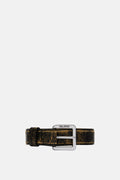 Elevate your essentials with this striking crackle leather belt, where a distressed black surface fractures to unveil rich brown undertones. The intentional crackle effect creates visual depth and texture, offering a refined edge to both casual and polished looks. Crafted for those who appreciate understated sophistication, this belt seamlessly transitions from day to evening wear, adding character to any wardrobe.