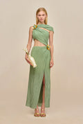 Elevate your evening with the Loah Dress, a maxi-length gown that combines artful origami plissé with sophisticated design. Its off-shoulder neckline and flattering torso cutout create a graceful silhouette, accentuated by shimmering gold-toned pleated metal embellishments. A slitted skirt adds movement and subtle allure, making this dress perfect for making a refined statement at any formal occasion.