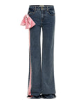 The Bentley Jean features a dark stone wash boyfriend style with a pink velvet bow and stripe detail, offering a comfortable yet refined look for everyday wear.