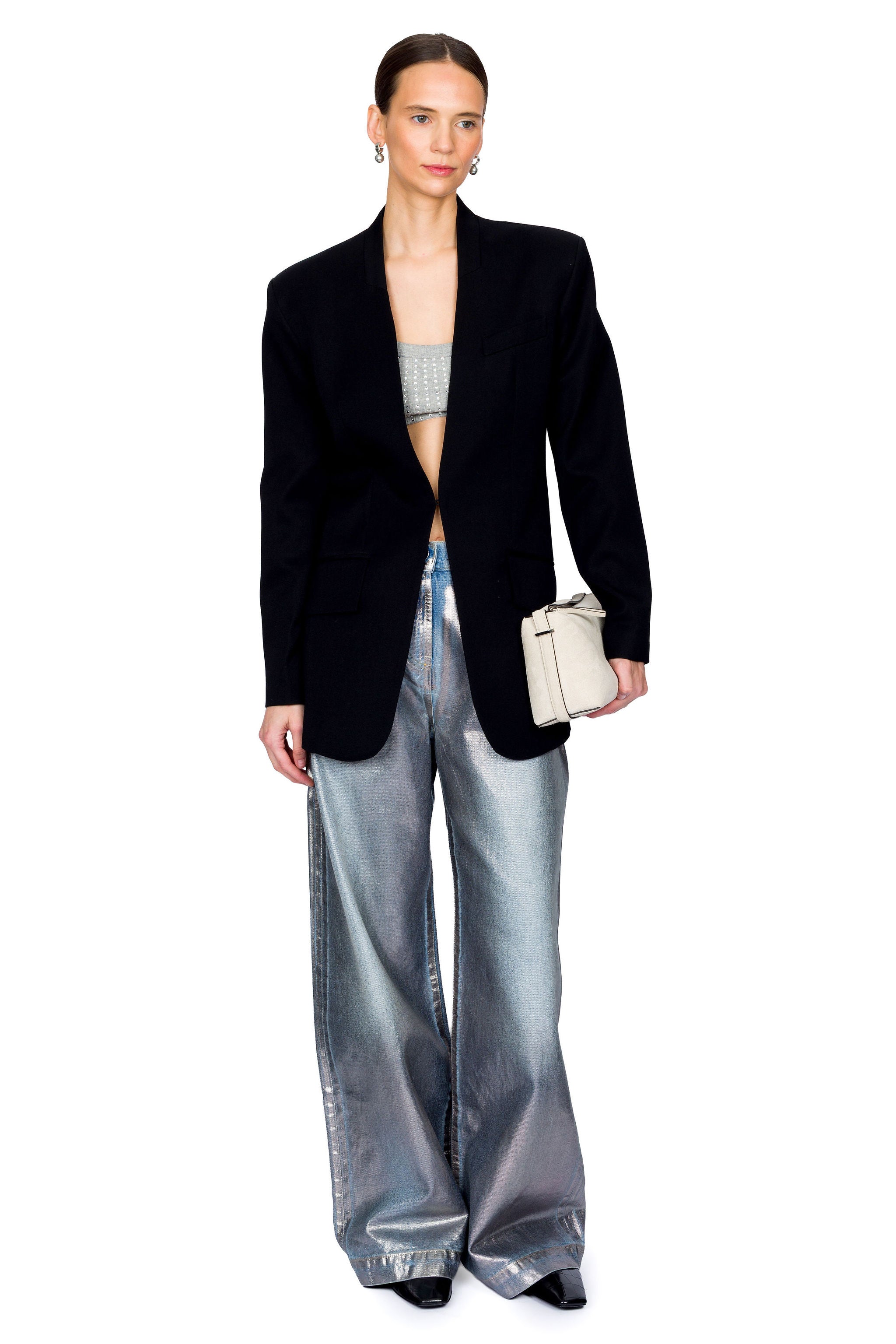 These high-waisted, wide-leg pants feature a striking silver and gold metallic coated rigid denim that adds a modern edge to your wardrobe. Designed for a flattering fit, they include a subtle logo patch on the back waistband for a touch of brand detail. Perfect for making a sophisticated statement with ease.