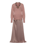 Elevate your wardrobe with the Ingie Dress, featuring a rose-colored sweater dress beautifully accented by an embroidered neckline. The satin skirt combo adds a graceful sheen and flowing silhouette, blending cozy comfort with elegant details for a refined, sophisticated look perfect for any special occasion.