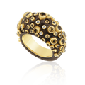 Crafted from hand-carved walnut wood, this distinctive ring merges natural warmth with refined elegance. Gold tube settings showcase VS+ lab-created diamonds, vibrant citrines, and golden yellow sapphires, while a polished gold inner rim adds a luxurious finishing touch. A striking piece that celebrates artisanal craftsmanship and sustainable materials.
