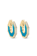 These Eclipse Small Octagon Hoops feature hand-carved turquoise set in elegant 18k yellow gold, accented with 0.66 carats of diamonds. Their unique shape and refined craftsmanship offer a subtle yet sophisticated touch to any outfit.