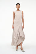The Viola Dress combines lightweight cotton nylon with elegant design. Its sleeveless cut and draped skirt create a striking asymmetrical hem, offering a refined silhouette that moves gracefully. Perfect for occasions that call for understated sophistication.