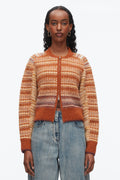 Embrace autumn's comfort with this cropped Fair Isle cardigan, crafted from lightweight alpaca yarn for a luxuriously soft feel. Its custom seasonal jacquard pattern in warm, earthy hues adds refined charm, while the contrast blanket stitch and zip front deliver elegant detail and practicality. Perfect for layering, this cardigan effortlessly combines cozy warmth with sophisticated style.