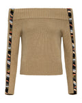 The Trevor Sweater in a warm camel hue features an elegant off-shoulder design that highlights the neckline with subtle sophistication. Intricate embroidery adds a refined artistic detail. Pair with the Cesar Jeans for a full Hellessy look.