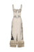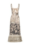 Embrace effortless elegance in this linen ankle dress, where timeless design meets seasonal sophistication. The botanical landscape print in black against a soft ecru base creates visual depth, while delicate straps and a charming front bow detail frame the softly structured bodice. The fluid skirt flows gracefully, finished with layered fringe that adds movement and texture with every step. Perfect for spring gatherings, garden parties, and warm evenings when you want to feel both comfortable and refined.