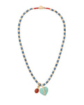 Elevate your everyday style with this sophisticated heishi necklace, featuring polished gold-tone accents and warm tiger's eye semi-precious beads. The piece showcases thoughtful details including a button closure with delicate macrame work, a turquoise heart charm, and a semi-precious carnelian cabochon accent. Perfect for layering or wearing solo, this versatile necklace blends natural stone beauty with refined craftsmanship for a look that transitions seamlessly from day to evening.