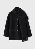 The Embroidered Scarf Jacket combines artisanal craftsmanship with sustainable materials, featuring an attached scarf delicately embroidered along the edges. Crafted from heavy, structured wool-blend felt certified by the Responsible Wool Standard, this jacket offers an oversized silhouette with dropped shoulders, wide sleeves with slits, and practical patch pockets. Its hip-grazing length pairs elegantly with straight trousers, creating a refined and contemporary look suited for sophisticated wardrobes.