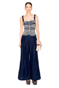 Desperte Pleated Pants in navy blue linen feature a refined silhouette with a high-waisted pleated front and flowing wide-leg cut. Perfect for elevated evening occasions, these tailored trousers pair beautifully with the Marea top and leather sandals for a polished, contemporary look. Crafted from breathable linen for comfort and style.